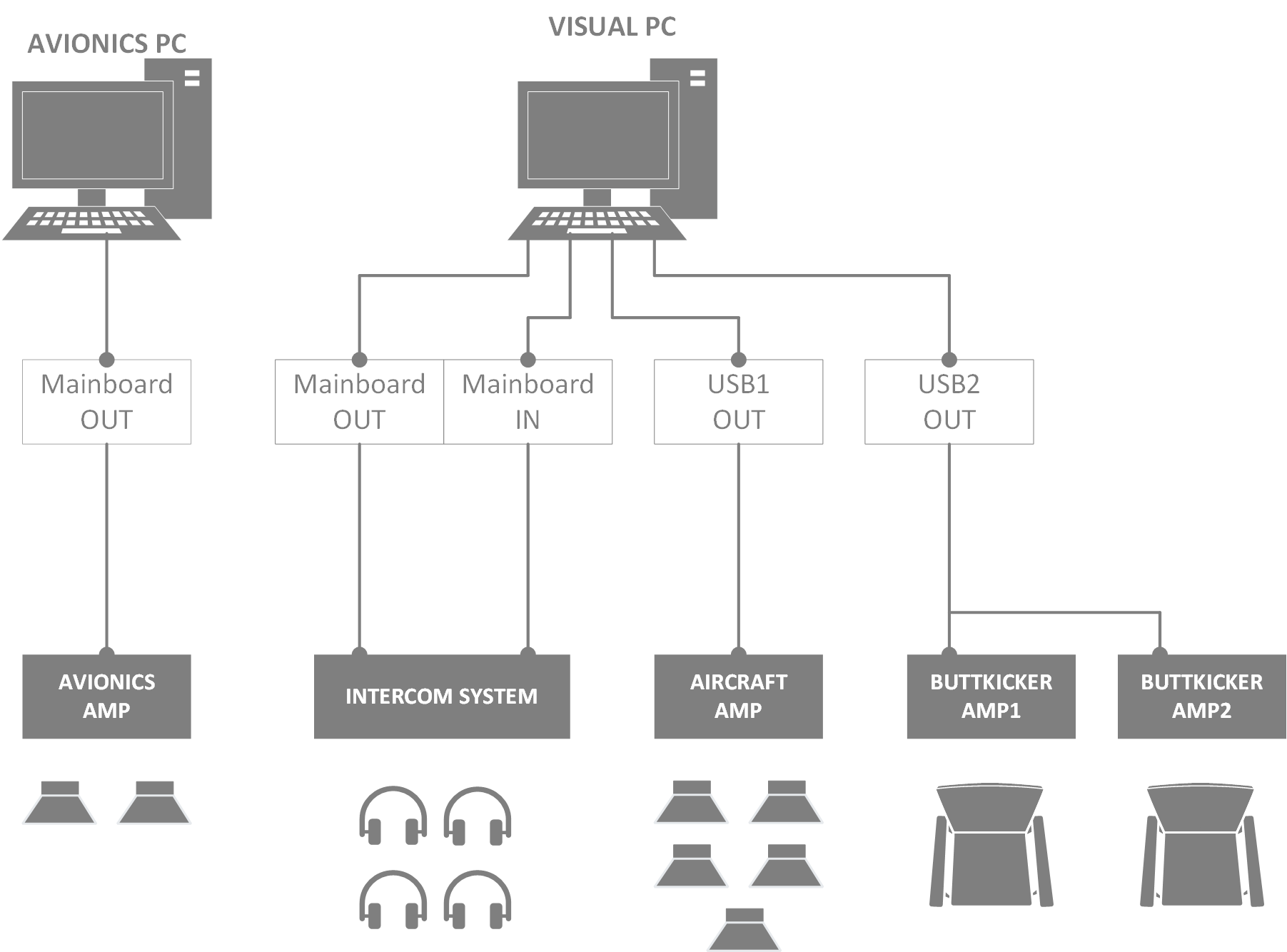 Could You share recommended audio setup? How to organize soundcards, signal distribution between ambient sound, cockpit sounds and comms.